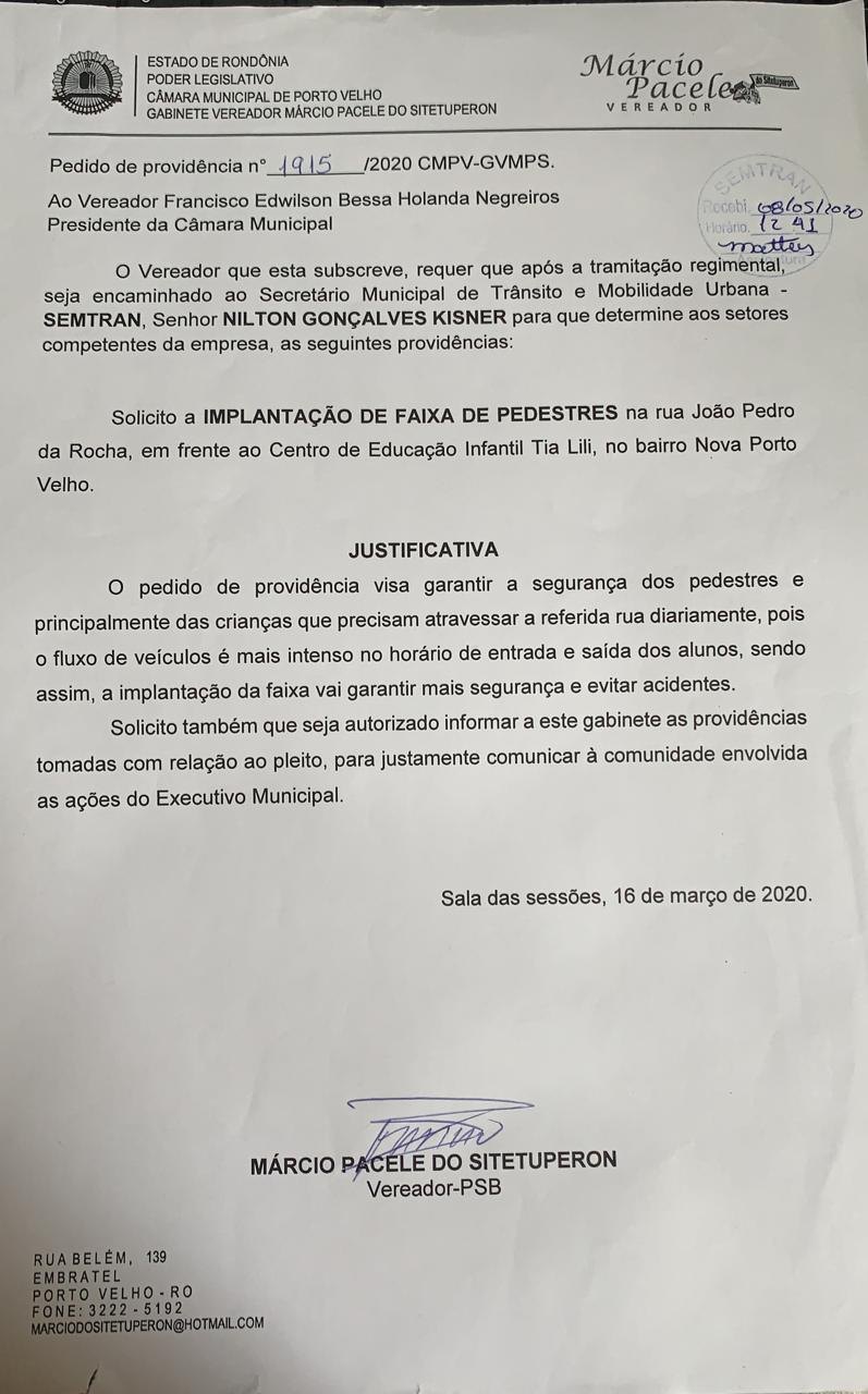 Atendendo mais um pedido feito pelo gabinete do vereador Marcio Pacele (PSB), a prefeitura de Porto Velho, por meio da Secretaria Municipal de Transporte e Trânsito – SEMTRAN, concluiu a implantação de faixa de pedestre em frente a Escola Infantil Tia Lili, localizada no Bairro Nova Porto Velho, zona Leste da Capital.