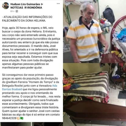 Nesse dado momento, entrei em contato com a Sra. Auxiliadora, dona da Funerária Pax Real, que argumentou essa questão da falta de documentação. Logo em seguida, entrei em contato com a Delegada Rosilei Lima, que de pronto fez o atendimento a família e resolveu a questão, encaminhando o corpo da Sra. Heliane para o IML, iniciando todo o processo de investigação do caso.