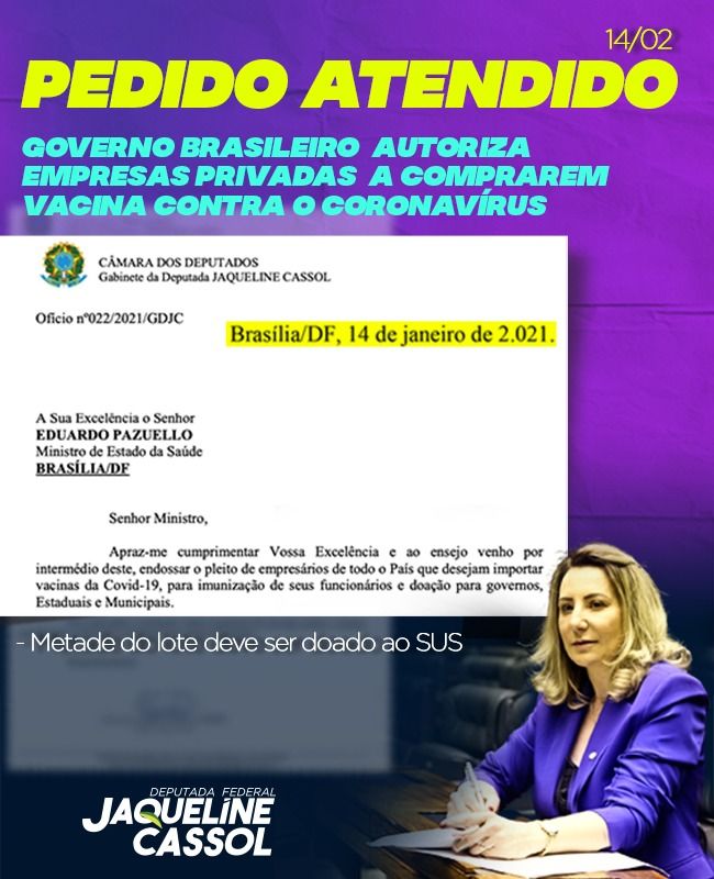 O Governo Federal deu o aval para que empresas privadas comprem doses da vacina contra a Covid-19 da fabricante AstraZeneca. A deputada federal Jaqueline Cassol (PP-RO) foi uma das parlamentares que solicitou a autorização ao Ministério da Saúde para acelerar a imunização à população brasileira. O pedido foi feito em 14 de janeiro e atendido pelo governo nessa terça-feira (26).