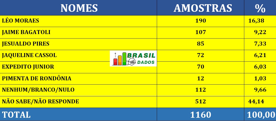 Léo Moraes, que já foi vereador e deputado estadual, desponta como um dos principais nomes da corrida sucessória ao Senado com 16,38% de popularidade, seguido de Jaime Bagatoli com 9,22%, do ex-prefeito Jesualdo Pires (PSB) com 7,33%¨, da deputada federal Jaqueline Cassol (PP) com 6,21%, do ex-senador Expedito Junior (PSDB) com 6,03% e do psolista Pimenta de Rondônia com 1,03%.