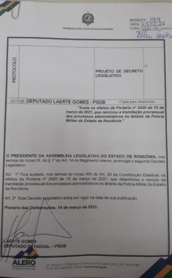 O deputado estadual Laerte Gomes, apresentou e teve aprovado o Projeto de Decreto Legislativo que sustou os efeitos da portaria n° 2420 de 08 de março de 2021, que reinicia a marcha processual dos Processos Administrativos Disciplinares (PADS, PAD, CD, CJ) no âmbito da Polícia Militar do Estado de Rondônia e dá outras providências.