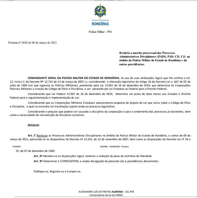 A propositura aprovada pelos parlamentares, que teve como relator o deputado Anderson Pereira, é devido o Comandante Geral da Policia Militar, ter expedido no dia 08 de Março de 2021, a portaria n° 2420 de 08 de março de 2021, que reinicia a marcha processual dos Processos Administrativos Disciplinares (PADS, PAD, CD, CJ) no âmbito da Polícia Militar do Estado de Rondônia e dá outras providências, mesmo com a não aprovação do Código de Ética pelo Poder Legislativo.