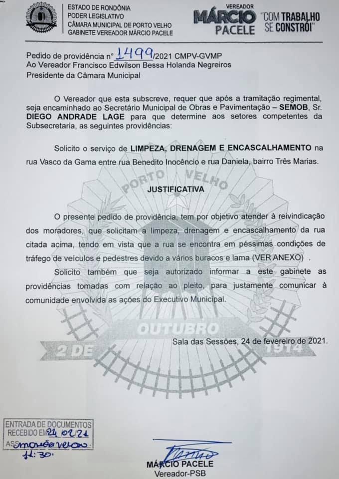 A Prefeitura, por meio da Secretaria Municipal de Obras (Semob), atende a pedido de providência de autoria do vereador Márcio Pacele e realiza serviço de limpeza e encascalhamento da rua Vasco da Gama, bairro Três Marias, zona Leste de Porto Velho.