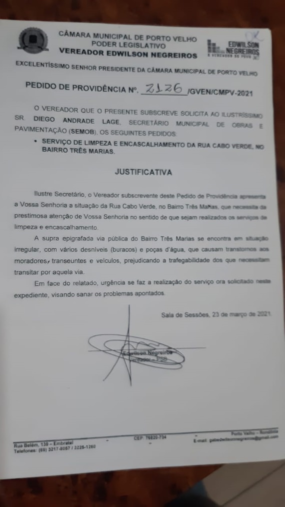A Prefeitura de Porto Velho, gestão Hildon Chaves (PSDB), via serviço determinado pelo titular da pasta de Obras e Pavimentação (SEMOB) Diego Lage, atendeu nova solicitação de providência apresentada pelo vereador Edwilson Negreiros, do PSB.