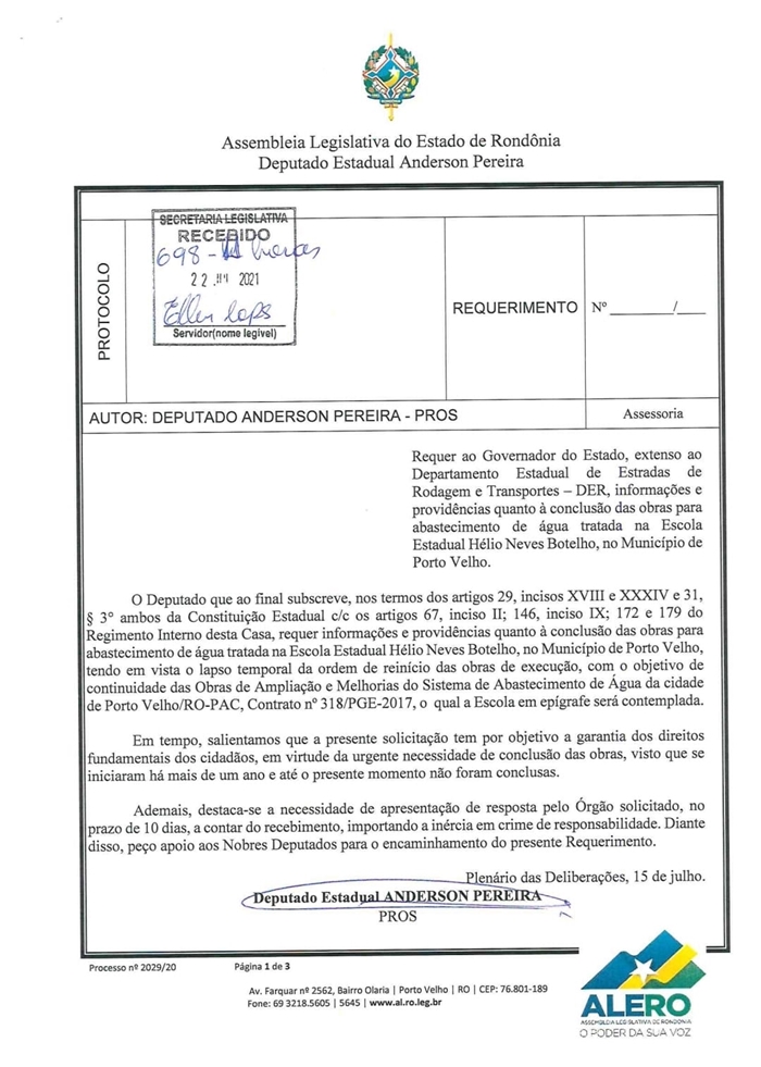 O deputado estadual Anderson Pereira (PROS), encaminhou ao Governo do Estado com cópia ao Departamento de Estradas e Rodagens – DER, requerimento solicitando informações e providências quanto à conclusão das obras para abastecimento de água tratada na Escola Estadual Hélio Neves Botelho, localizada na zona Sul de Porto Velho.