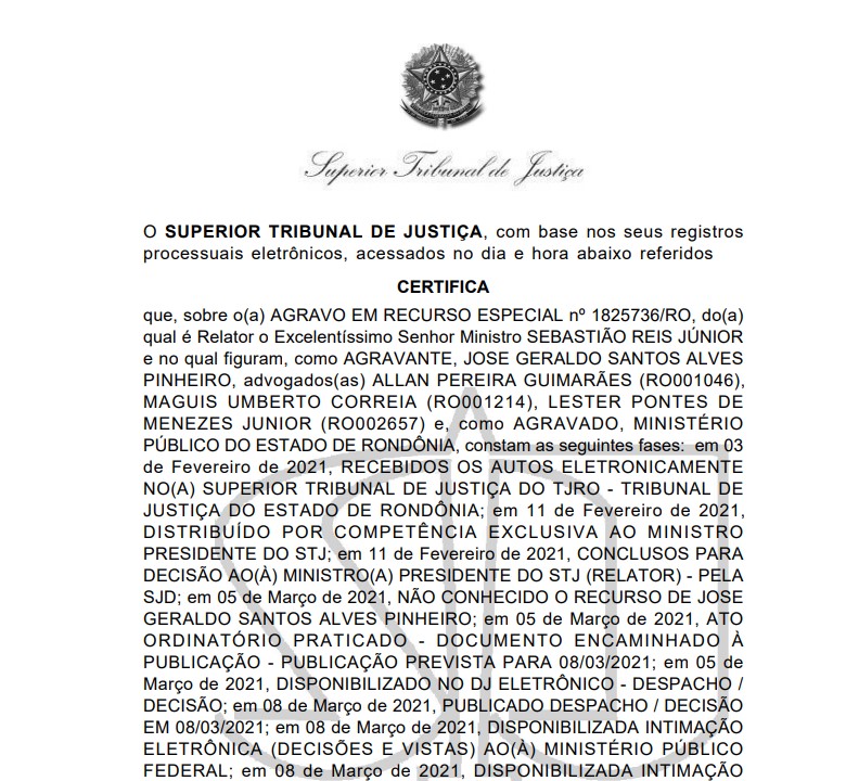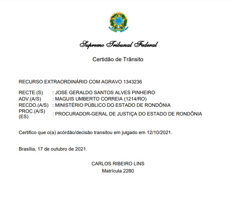 Rondoniaovivo teve acesso às certidões de trânsito em julgado dos recursos que estavam sob análise do Superior Tribunal de Justiça (STJ) e do Supremo Tribunal Federal (STF) contra o deputado estadual Geraldo da Rondônia (PSC).