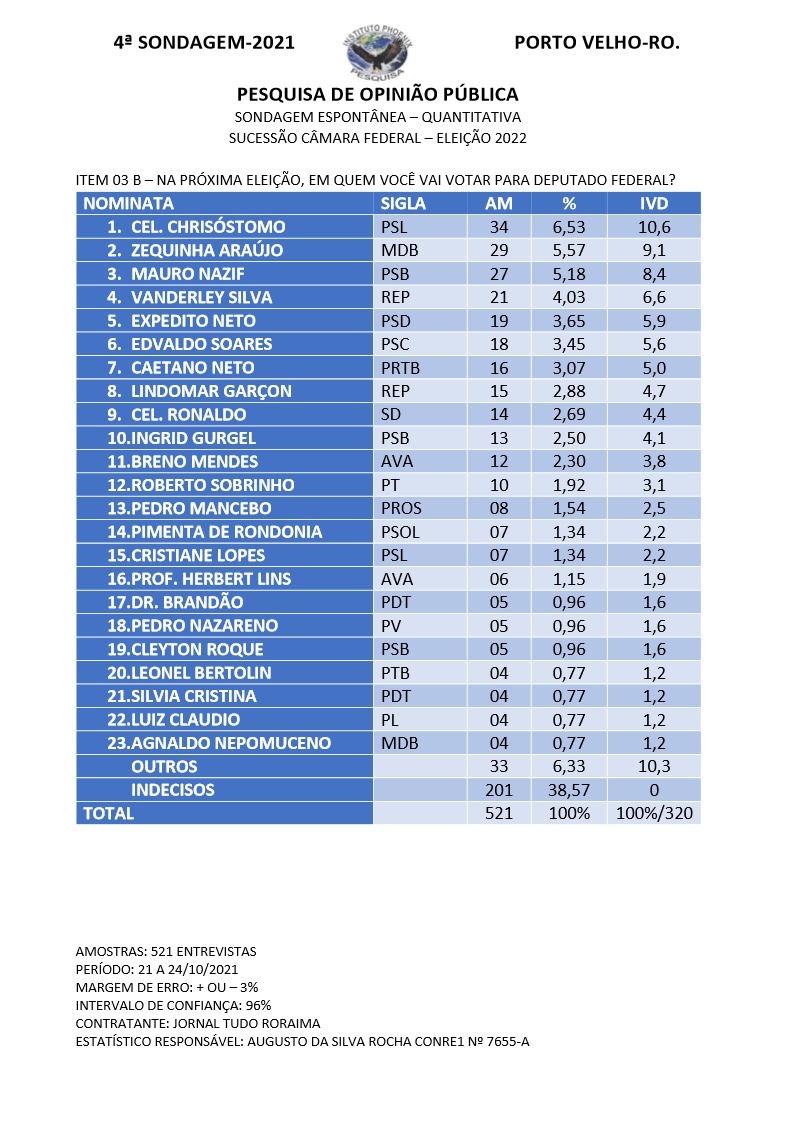 Em primeiro lugar está o deputado federal com base em Porto Velho, coronel Chrisóstomo (PSL), com 6,53% de intenções.