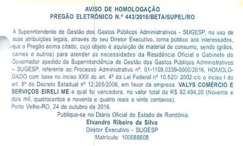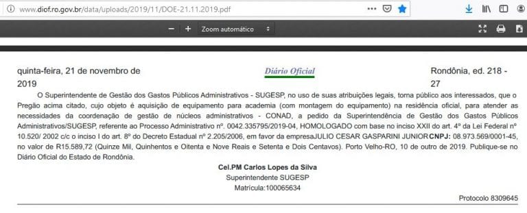 Rondoniaovivo, a Sugesp informou que os gastos com o governador do Estado, inclusive de sua residência, são previstos na Lei Complementar 965 de 20 dezembro de 2017, e que as despesas não ferem os princípios administrativos e nem a moralidade pública.