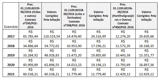 No ano passado (já que este ano ainda não terminou), o Governo do Estado gastou com o governador e sua família: R$ 45.909,89 (grãos e outros), mais R$ 14.013,23 (leite e derivados) e R$ 13.793,69 (hortifrutigranjeiros), com total de R$ 73.716,81. O valor corrigido pela inflação fica em R$ 100.992,04 e a tabela comparativa segue abaixo.