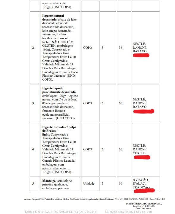 Os pedidos incluem quatro tipos de iogurte (de frutas vermelhas, natural, parcialmente desnatado e de polpa de frutas light), quatro tipos de queijos (minas frescal, muçarela, prato e parmesão ralado) e quatro tipos de leite (UHT integral e desnatado e em pó – desnatado e integral), entre tantas outras exigências.
