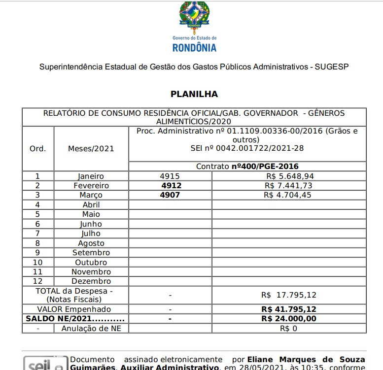 Um dos exemplos: no mês de fevereiro de 2021, a residência oficial do Governo de Rondônia consumiu R$ 7.441,73 em alimentação.