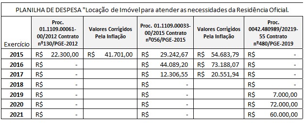 Tabela comparativa dos gastos com aluguel dos últimos governadores de Rondônia