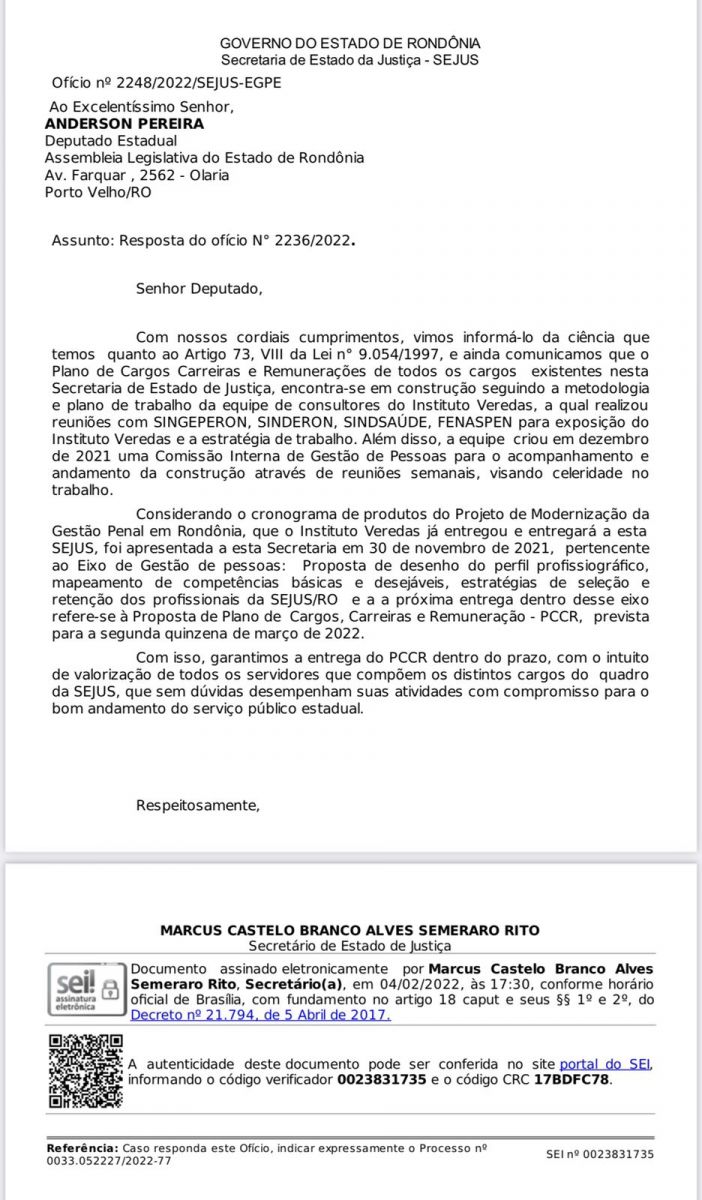 Atendendo uma solicitação do deputado estadual Anderson Pereira (PROS), a Secretaria de Estado de Justiça – Sejus, através do ofício nº 2248/2022/SEJUS-EGPE, direcionando ao pedido do parlamentar, assegurou que o Plano de Cargos, Carreira e Remuneração – PCCR, de toda a categoria está em fase de conclusão e será entregue ainda no primeiro trimestre deste ano.