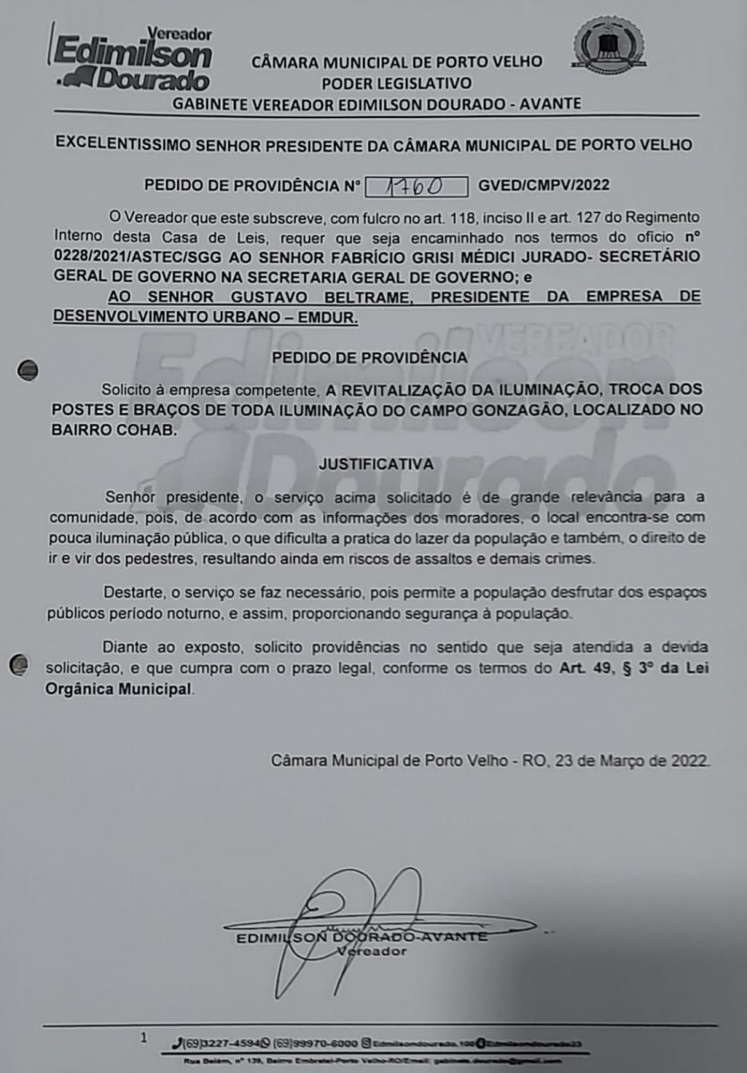 Através do Pedido de Providência nº 1.760, o vereador Edimilson Dourado (Avante), solicitou junto ao presidente Gustavo Beltrame (da Empresa Municipal de Desenvolvimento Urbano -Emdur), que fosse feita a revitalização da iluminação, troca de postes e braços de toda a iluminação do Campo Gonzagão.