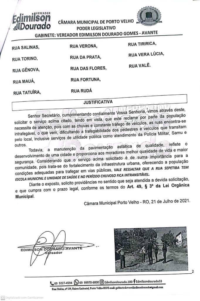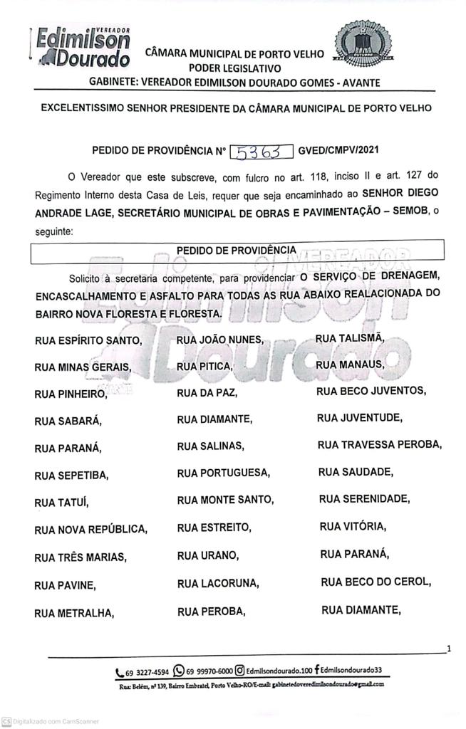 Através do Pedido de Providência nº 5.363, o vereador Edimilson Dourado (Avante), solicitou Junto à Secretaria Municipal de Obras e Pavimentação (Semob), os serviços de drenagem, encascalhamento e asfalto para quase 50 ruas na zona sul de Porto Velho.