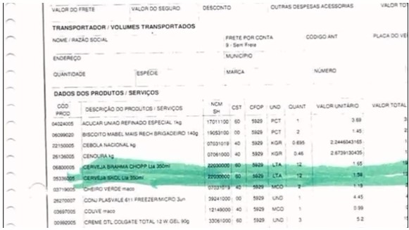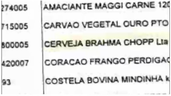 Outra nota fiscal apresentada ainda mostra a compra de carvão, novamente cerveja, coração de frango e costela supostamente com dinheiro público
