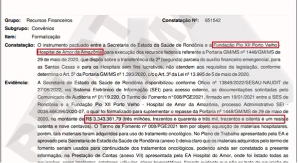 Conforme a gravação, a auditoria do SUS [Sistema Único de Saúde] encontrou “graves inconsistências” e pede a devolução de recursos com juros e correção monetária. Os valores são de quase R$ 3,5 milhões.
