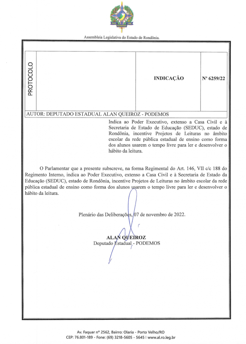 O Deputado Estadual Alan Queiroz (Podemos) indicou ao Poder Executivo, por meio SEDUC do estado de Rondônia, que incentive Projetos de Leituras no âmbito escolar da rede pública estadual de ensino como forma dos alunos usarem o tempo livre para ler e desenvolver o hábito da leitura.