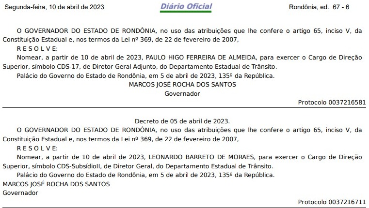 Depois de muitas idas e vindas, além de boatos e notícias falsas, enfim o ex-deputado federal Léo Moraes (Podemos) teve sua nomeação publicada como diretor-geral do Detran (Departamento Estadual de Trânsito) nesta segunda-feira (10), no Diário Oficial do Estado (DOE).