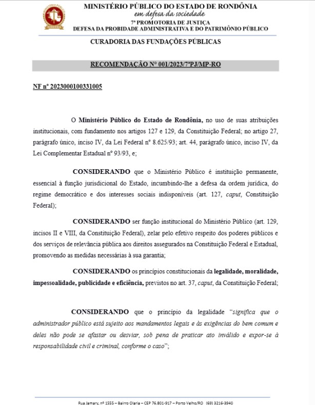 A recomendação, assinada pelo promotor de justiça, Geraldo Henrique Ramos Guimarães, nesta quarta-feira, 14, Curador das Fundações também é destinada ao Diretor Executivo do “Hospital do Amor” da Amazônia, Jean Negreiros.