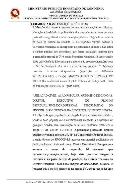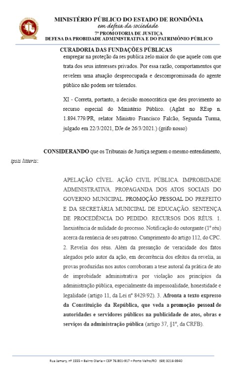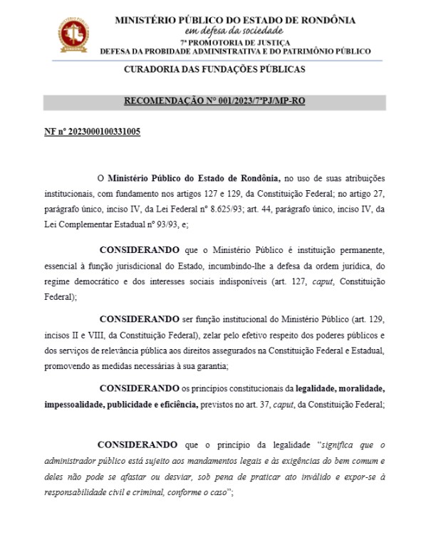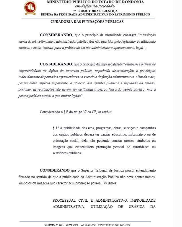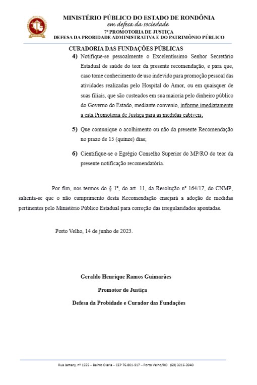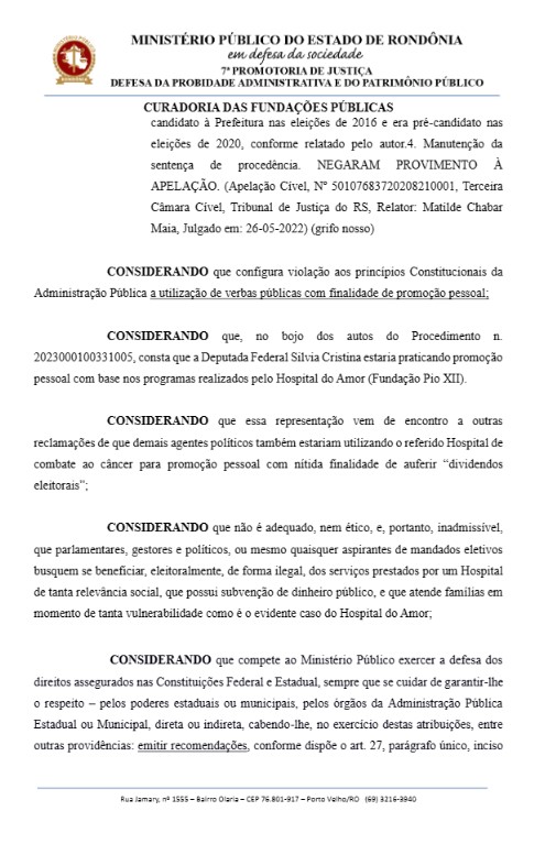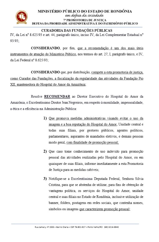 Na peça, o promotor recomenda que a Silvia Cristina que, em respeito à moralidade, impessoalidade, a ética e a eficiência na Administração Pública, se abstenha de utilizar, para fins de obtenção de vantagens política, os serviços do “Hospital do Amor”, unidade central e suas filiais no Estado de Rondônia, inclusive utilização de banner, folders, postagens em redes sociais, que contenha nomes, símbolos ou imagens que caracterizem promoção pessoal.