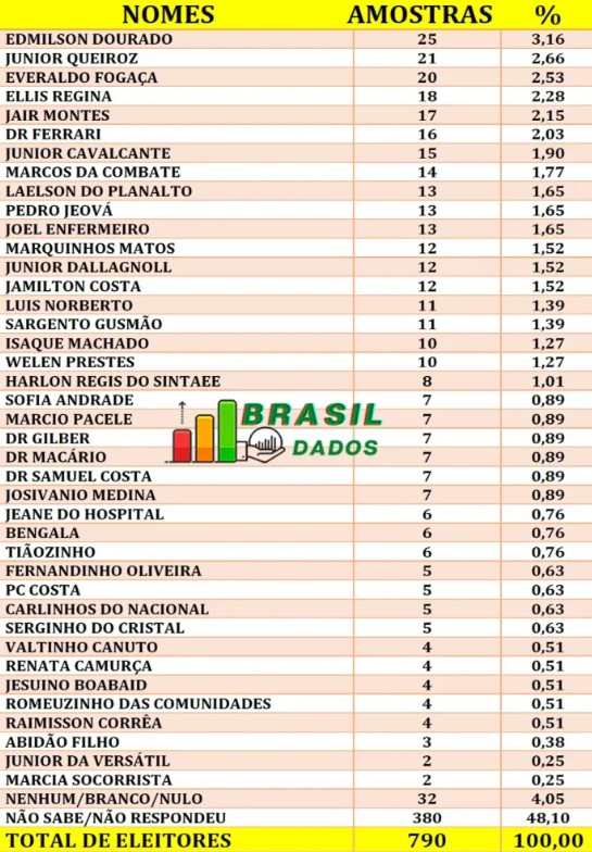 Segundo a pesquisa, se a eleição fosse hoje, as quatro primeiras colocações seriam ocupadas pelos vereadores Edmilson Dourado (3,16%), Junior Queiroz (2,66%), Everaldo Fogaça (2,53%) e Ellis Regina (2,28%). Na sequência aparecem o ex-vereador Jair Montes (2,15%), Dr. Ferrari (2,03%) e o ex-vereador Junior Cavalcante (1,90%).