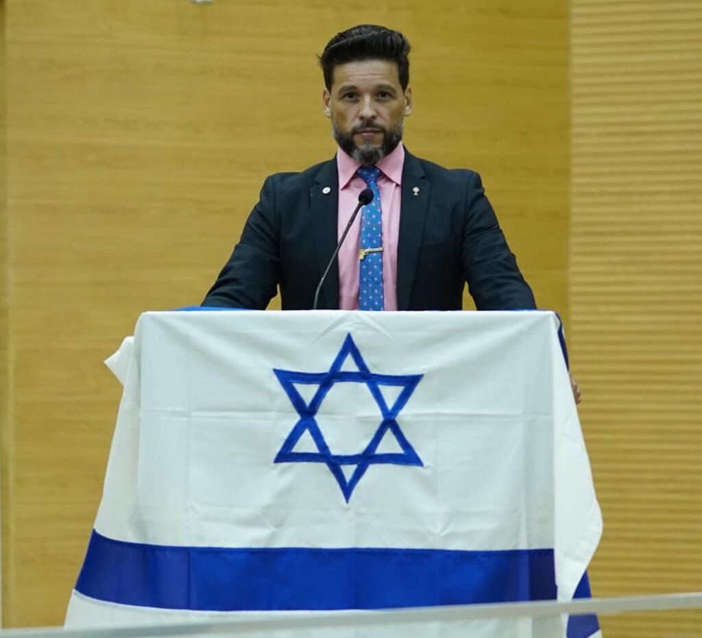 Rodrigo Camargo coloca bandeira de Israel na tribuna do plenário da Alero, mas parece desconhecer história que envolve conflito e que judaísmo não reconhece Jesus como salvador - Foto: Divulgação/Alero