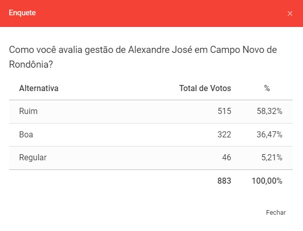 No último sábado (11), foi feita uma que questionou aos leitores do jornal eletrônico como avaliam a administração do prefeito Alexandre José, no município de Campo Novo de Rondônia.