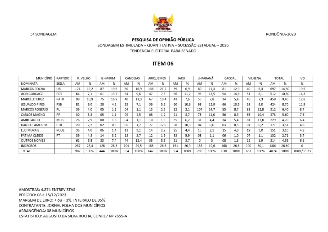 O Instituto Phoenix divulgou hoje os resultados da 5ª Sondagem de Opinião Pública, apresentando a tendência eleitoral para o Senado no estado em 2026. A pesquisa, realizada entre os dias 8 a 15 de dezembro de 2023, entrevistou 4.874 pessoas em 8 municípios, com uma margem de erro de +/- 3%.