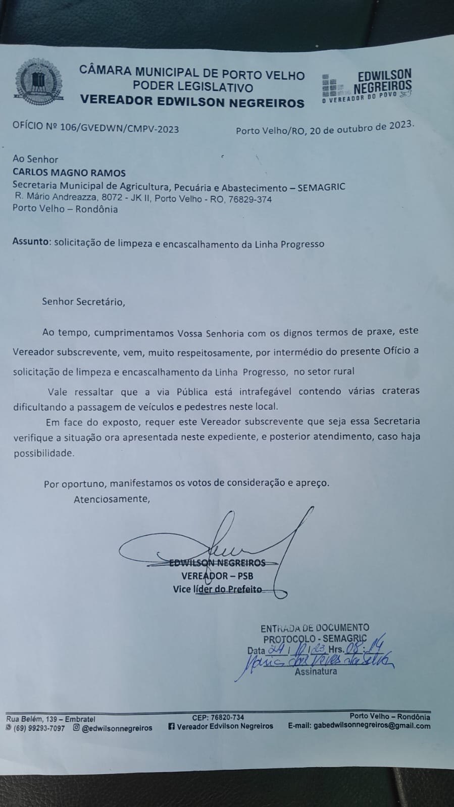 A Prefeitura de Porto Velho atendeu mais um pedido apresentado pelo Gabinete do vereador Edwilson Negreiros, do PSB, membro da Casa de Leis municipal.