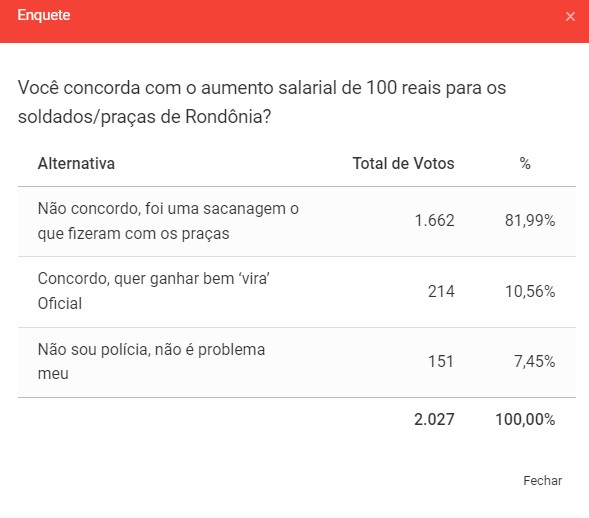 E o resultado foi uma vitória de “lavada” da alternativa “não concordo, foi uma sacanagem o que fizeram a tropa” com 1.662 votos ou 81,99% do total.
