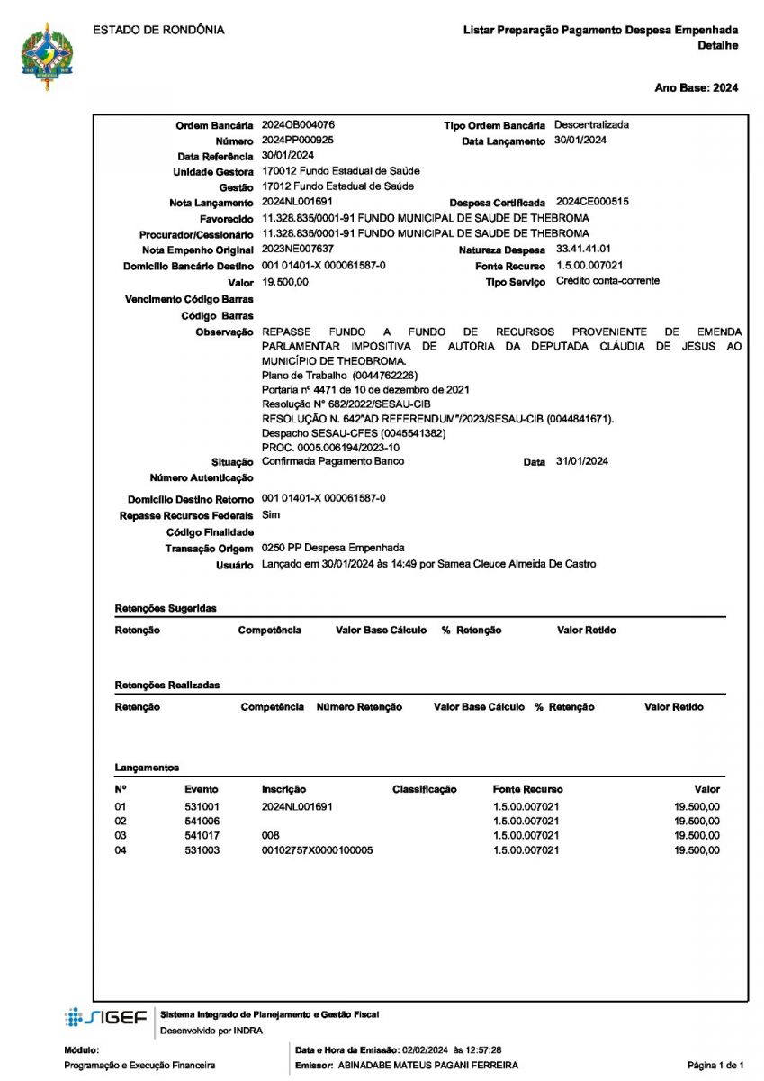 Por meio do mandato da deputada estadual Cláudia de Jesus (PT), a cidade de Theobroma terá mais condições de melhorar os serviços de saúde. A prefeitura já recebeu o pagamento de duas emendas parlamentares da deputada para custeio de medicamentos. No total foram repassados R$ 140 mil.