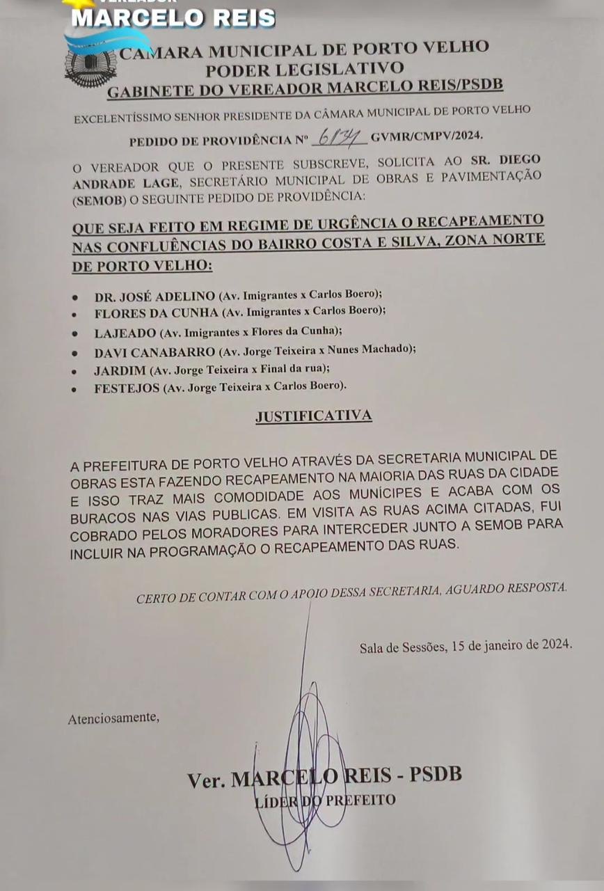 O vereador Marcelo Reis, de Porto Velho, teve seu pedido de providência atendido pela Secretaria Municipal de Obras (SEMOB) para a realização de serviços de recapeamento nos bairros Costa e Silva e zona Norte da capital. O atendimento da demanda incluiu as ruas Dr. José Adelino, Flores da Cunha, Lageado, Davi Canabarro e rua Festejos.