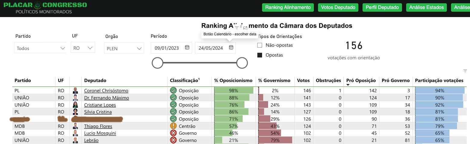 Um exemplo disto é o Placar Congresso, que avalia o alinhamento dos políticos com suas Bancadas no Congresso Nacional.