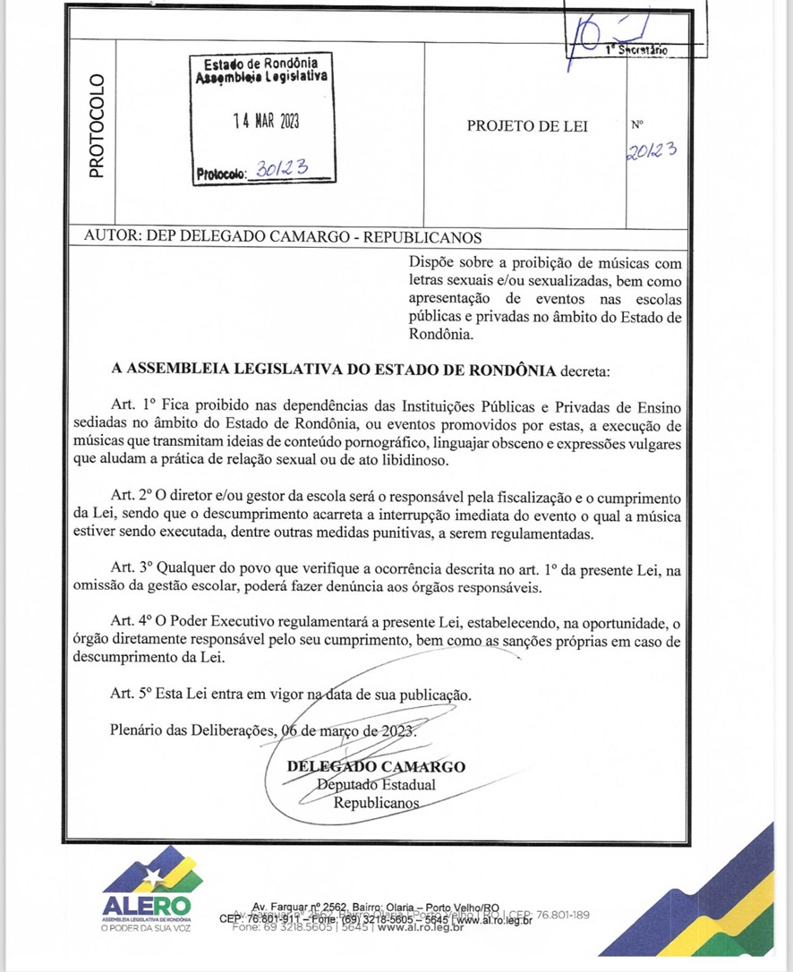Foi assinada nesta semana pelo governador do estado a Lei estadual 5823/2024, que proíbe a utilização de músicas com cunho sexual nas escolas públicas e privadas de Rondônia. A Lei é resultado de Projeto de Lei 20/2023 apresentado pelo deputado Delegado Camargo (Republicanos) e aprovado na Assembleia Legislativa, que agora segue para a regulamentação e aplicação.