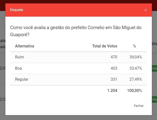 A maioria dos internautas que votou na última enquete do Rondoniaovivo afirma que a gestão de Cornélio Duarte (UB), prefeito de São Miguel do Guaporé (RO) é ruim.