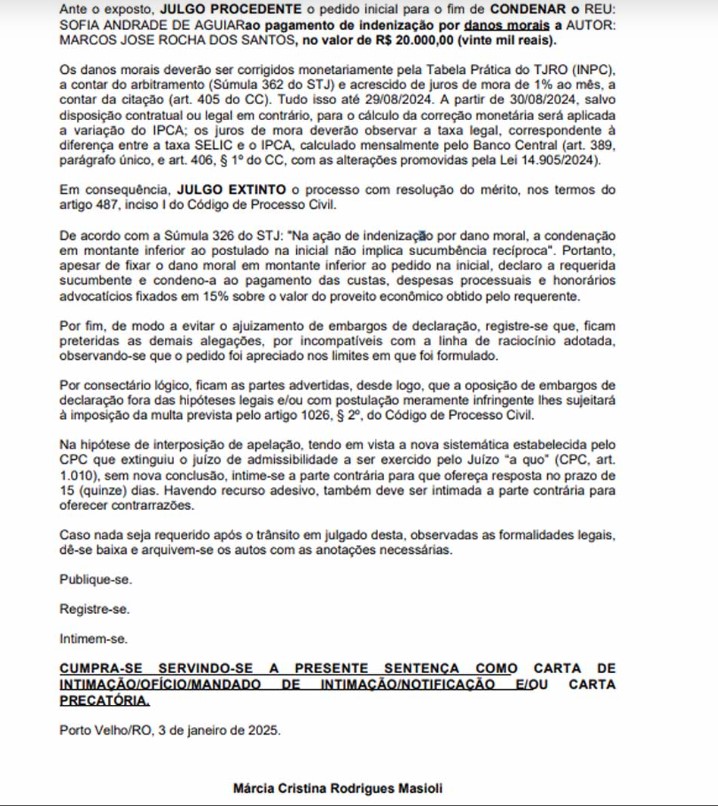 Além da indenização, Sofia Andrade foi condenada ao pagamento das custas processuais e honorários advocatícios, fixados em 15% do valor da condenação.