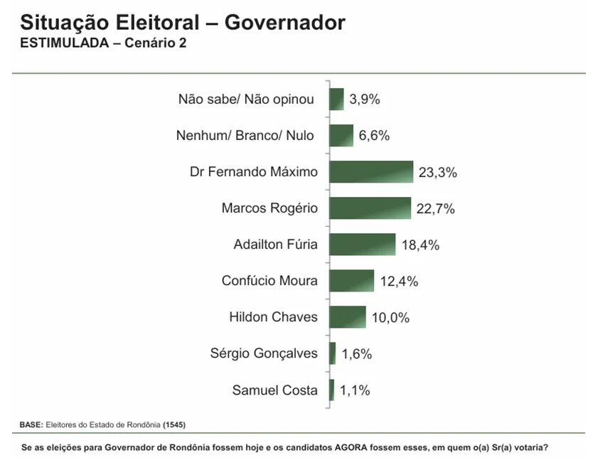 Na pesquisa com a inclusão do nome do senador Marcos Rogério, os resultados continuam apontando Dr. Fernando Máximo em primeiro lugar, com 23,3%, uma vantagem dentro da margem de erro em relação a Rogério, com 22,7%. Próximo aos dois aparece Adaílton Fúria, com 18,4%.