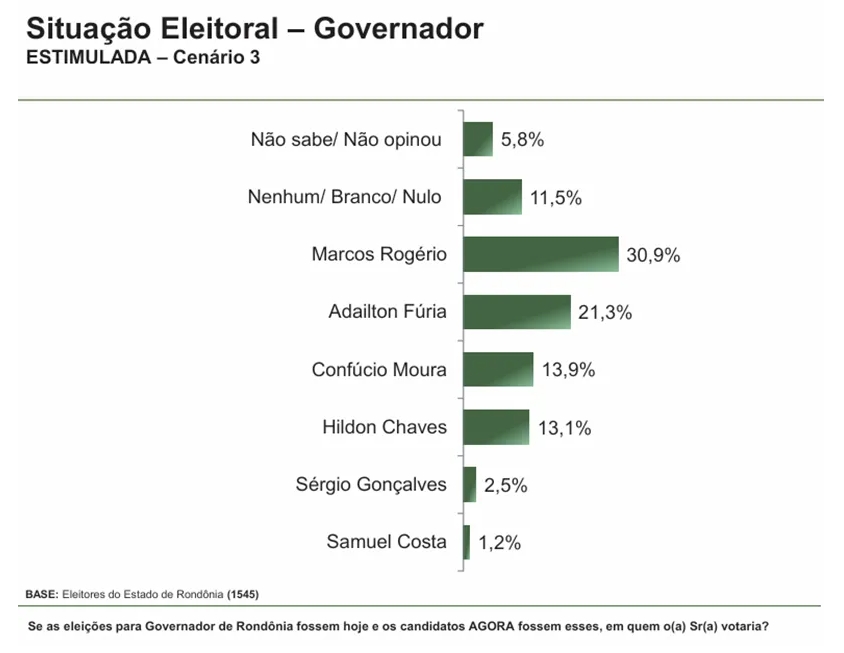 No terceiro cenário foi excluído o nome do Dr. Fernando Máximo, e quem aparece com vantagem é Marcos Rogério, com 30,9%, seguido de Adailton Fúria, com 21,3%.