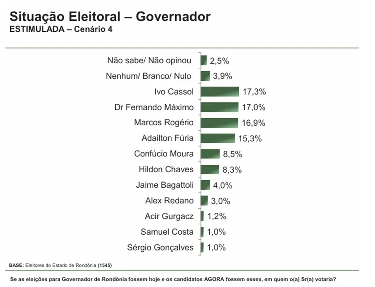 Nesta pesquisa foram incluídos os nomes do ex-governador Ivo Cassol, do senador Jaime Bagattoli, do presidente da Assembleia Legislativa de Rondônia, Alex Redano, e do ex-senador Acir Gurgacz.