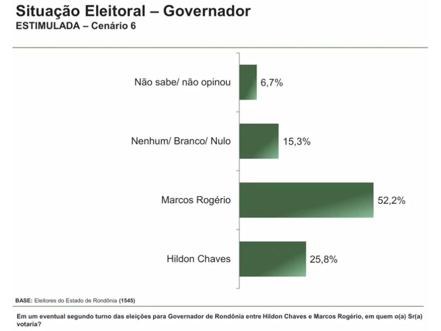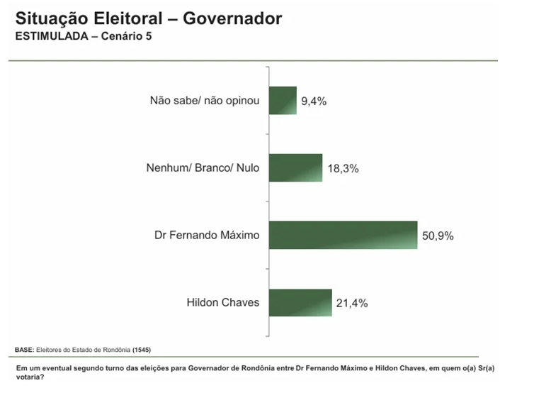 Neste cenário, a pesquisa perguntou: “Em um eventual segundo turno das eleições para governador de Rondônia entre Dr. Fernando Máximo e Hildon Chaves, em quem o(a) Sr(a) votaria?”, e obteve como resultado: Máximo com 50,9% das intenções de voto, e Hildon com 21,4%.