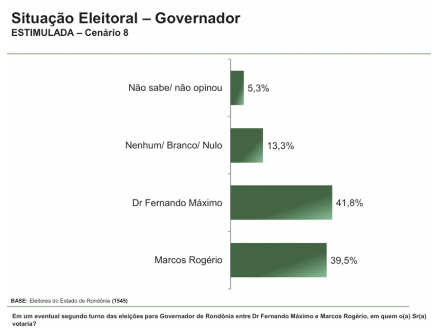 O Instituto perguntou em quem as pessoas votariam em um eventual segundo turno das eleições para governador de Rondônia entre Dr. Fernando Máximo e Marcos Rogério.