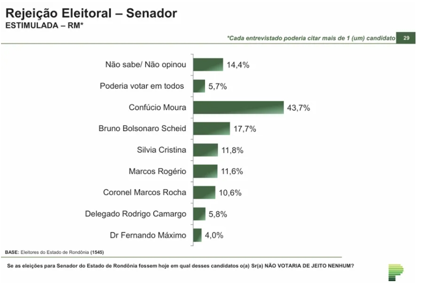 A maior rejeição foi de Confúcio Moura, com 43,7%. Bruno Bolsonaro Scheid aparece com a segunda maior rejeição, com 17,7%. Silvia Cristina, em terceiro na pesquisa de rejeição, teve 11,8%. Marcos Rogério teve rejeição de 11,6%, Marcos Rocha de 10,6%, Delegado Rodrigo Camargo 5,8%, e Dr. Fernando Máximo foi citado por 4%.