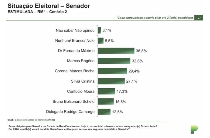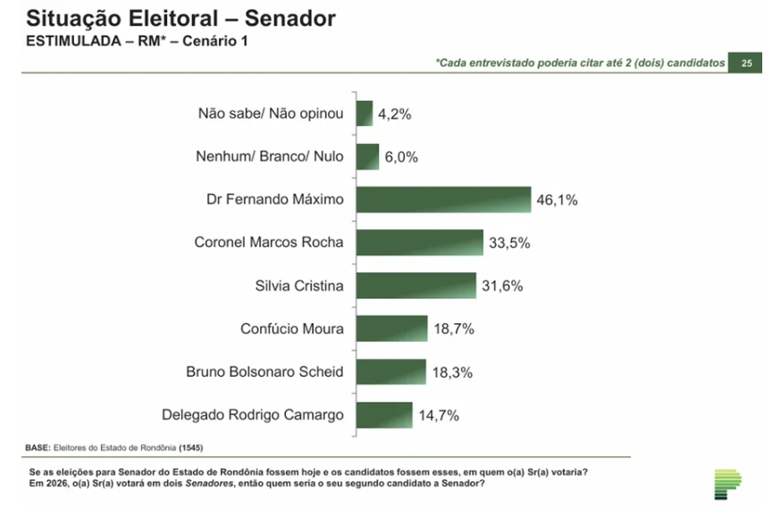Sondagem realizada pelo Instituto Paraná de Pesquisas para testar os pré-candidatos ao Senado, nas eleições de 2026 em Rondônia, indica um quadro bastante disputado com favoritismo para os candidatos da direita. A pesquisa foi encomendada pelo Rondovisão testando diferentes cenários. Os nomes mais citados foram do deputado federal Dr. Fernando Máximo, do atual senador Marcos Rogério e do governador Marcos Rocha. Também foi medida a rejeição dos possíveis candidatos.