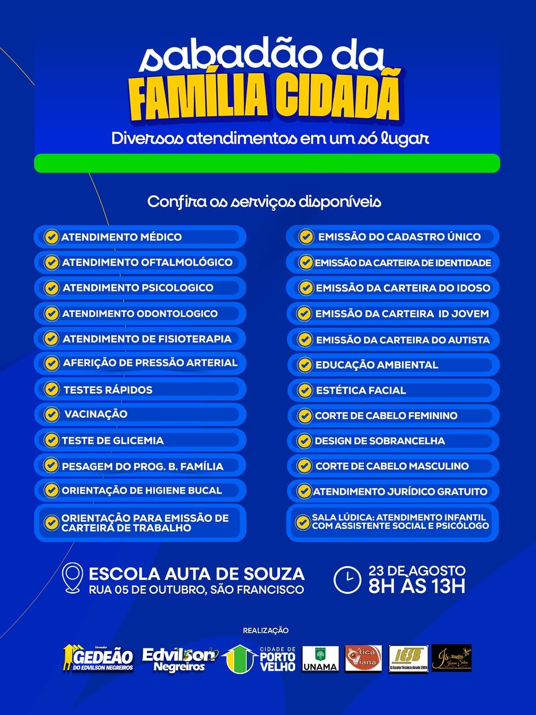 A população de Porto Velho (RO) vai poder aproveitar, no dia 23 deste mês, das 8h às 13h, de 20 serviços disponibilizados gratuitamente na Escola Auta de Souza, localizada na rua 5 de outubro, bairro São Francisco, zona Leste da capital. O ‘1º Sabadão da Família Cidadã’ é uma realização do vereador e presidente da Câmara Municipal Gedeão Negreiros (PSDB), em conjunto de Edvilson Negreiros e a Prefeitura de Porto Velho.