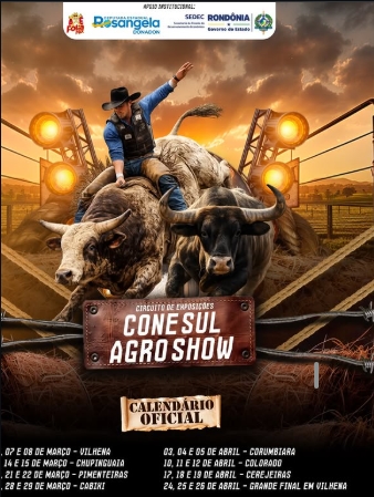 O Cone Sul de Rondônia vai receber, entre os meses de março e abril de 2026, a primeira edição do Circuito de Exposições Cone Sul Agro Show. O evento levará rodeio, feira de exposições, expositores e atrações culturais a diversos municípios da região, fortalecendo o agronegócio e a economia local.