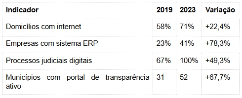 A telefonia móvel 4G alcança hoje 94% dos municípios do estado, contra 62% em 2018. Essa capilaridade permitiu que pequenas prefeituras do interior implantassem sistemas de protocolo digital, emissão de alvarás eletrônicos e até consultas médicas por telemedicina, especialmente após a pandemia.