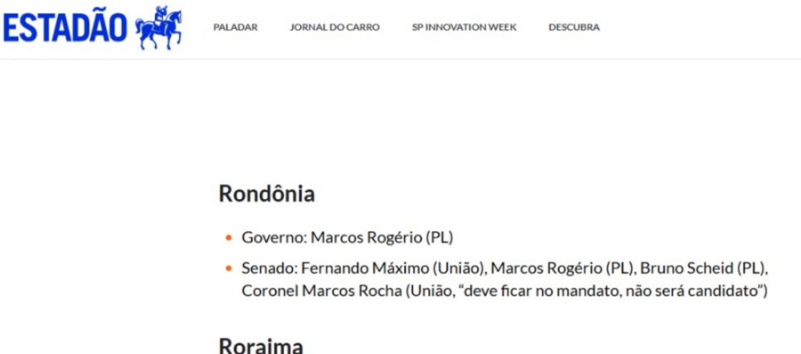 No caso de Rondônia, o documento indica que o governador Marcos Rocha (União Brasil) “deve ficar no mandato, não será candidato". A observação sugere a expectativa de que o atual chefe do Executivo estadual não dispute outro cargo no pleito.