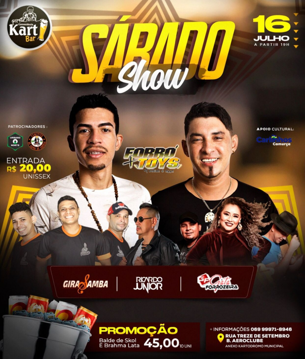 Dia 16 de julho às 20h, “Sábado Show” na Conveniência Kart Bar com Banda Forró Toys, Girasamba, Ricardo Junior e Gata Forrozeira. Reúna a família, os amigos e venha curtir o fim de semana com muita diversão e aproveitar as promoções.