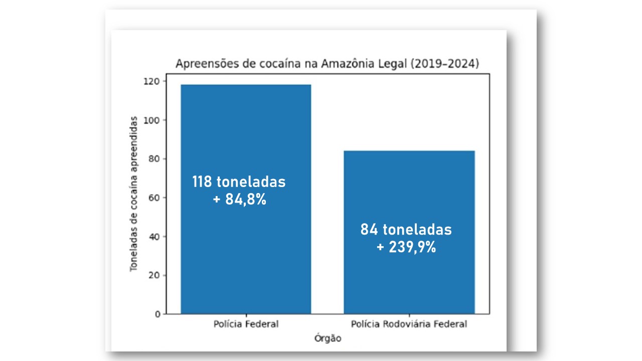 Entre 2019 e 2024, a Polícia Federal (PF) apreendeu 118 toneladas de cocaína nos estados da Amazônia Legal, volume 84,8% maior que o registrado no início do período. Já a Polícia Rodoviária Federal (PRF) retirou de circulação 84 toneladas da droga, com um crescimento ainda mais acentuado: 239,9% em cinco anos. A soma das apreensões feitas pela PF e PRF chegam a 344,7% no período.